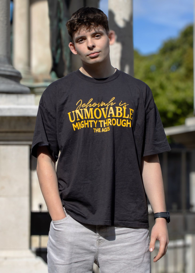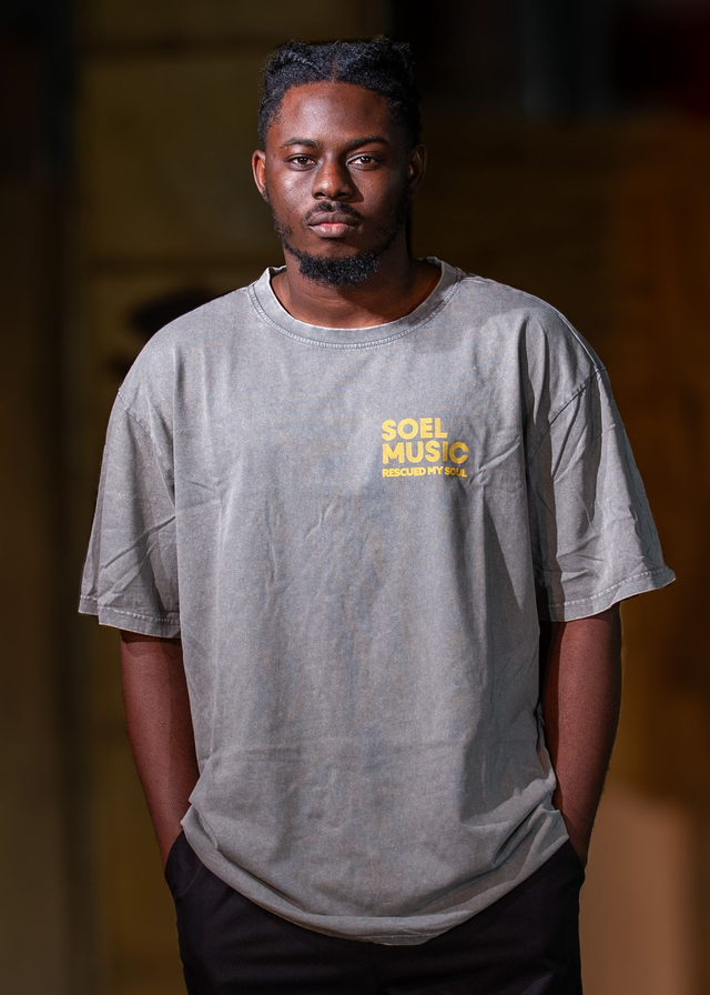 An oversized t-shirt in either asphalt or charcoal with yellow print.